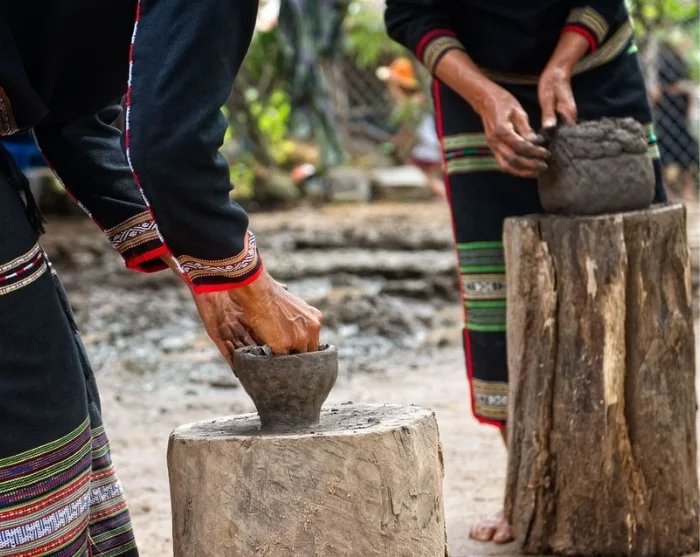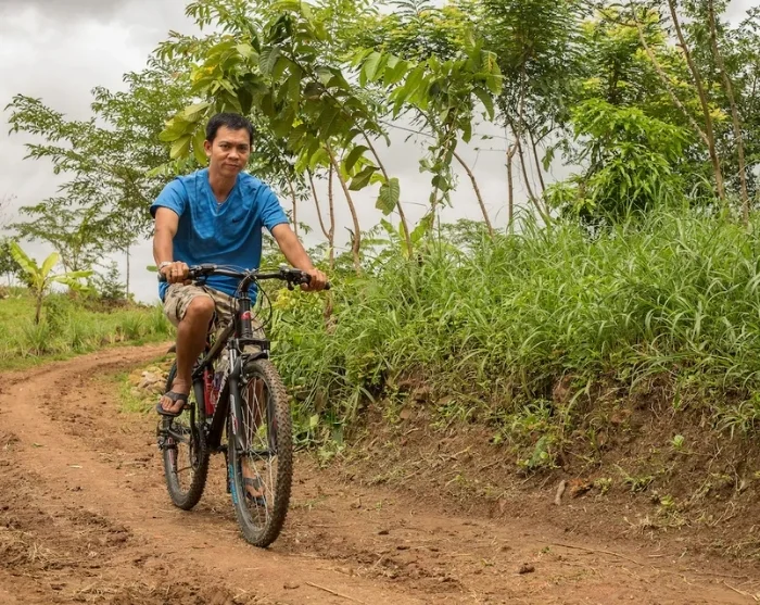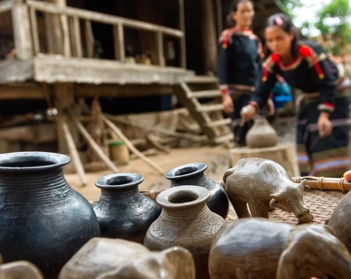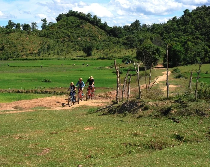 Efter frukosten cyklar du till byn Yang Tao, som ligger cirka 12 km från Lak Tented Camp. Här väntar en vacker färd genom gröna risfält, där du kan ha turen att få se bufflar och kor beta i flockar. I byn får du uppleva det skickliga hantverket bakom den traditionella M’nong-keramiken samt besöka kakaoplantager där du får provsmaka det speciella fermenterade kakaovinet.