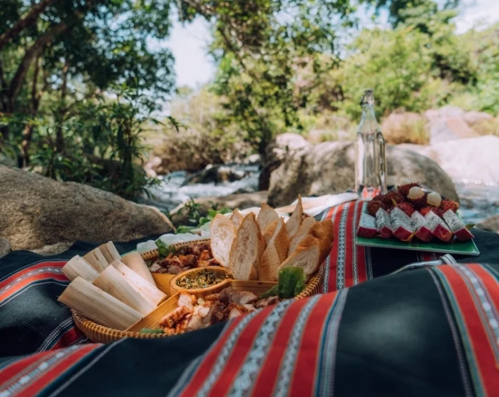 Därefter ger du dig ut på en spännande vandring till Bim Bip-fallen, där du på vägen kan njuta av vackra naturscener. Vid ankomst väntar en picknicklunch med traditionella rätter inslagna i bananblad – och kanske ett uppfriskande dopp i vattenfallets naturliga pool.