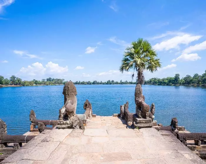 Efter cykelturen kan du njuta av dagens lunch vid den lugna Srah Srang-reservoaren.