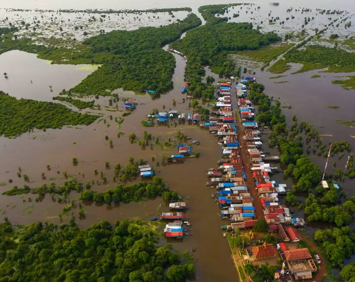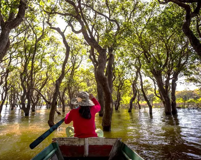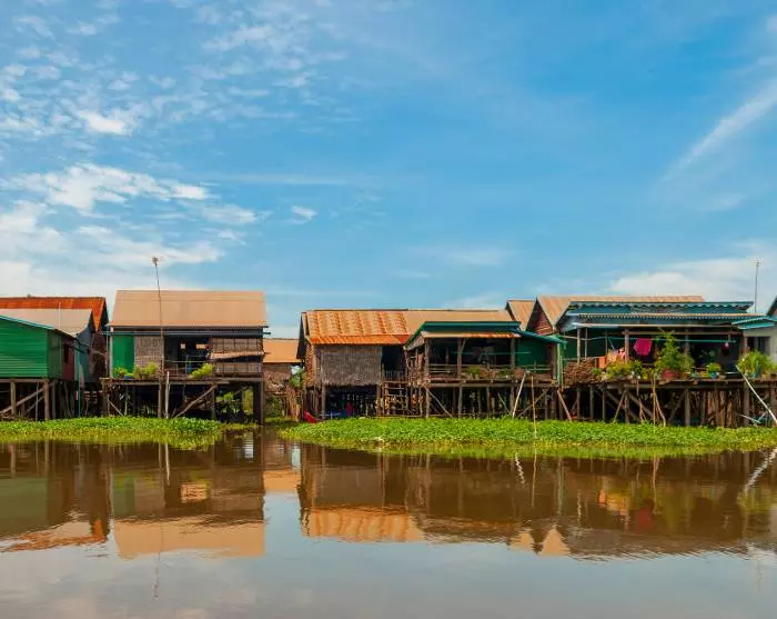 Du anländer vid Tonlé Saps strand och går ombord på en båt som tar dig till en av sjöns flytande byar. Här kan du på nära håll se hur livet är för många av de familjer som främst lever på fiske. Familjerna bor längs stranden i färgglada hus som står på långa styltor, så att de klarar av de höga vattennivåerna under regnperioden (augusti till början av februari), när byns smala gator omvandlas till små kanaler. Under den torra perioden (mitten av februari till juli), när vattennivåerna är lägre, är det lätt att se de höga styltorna.