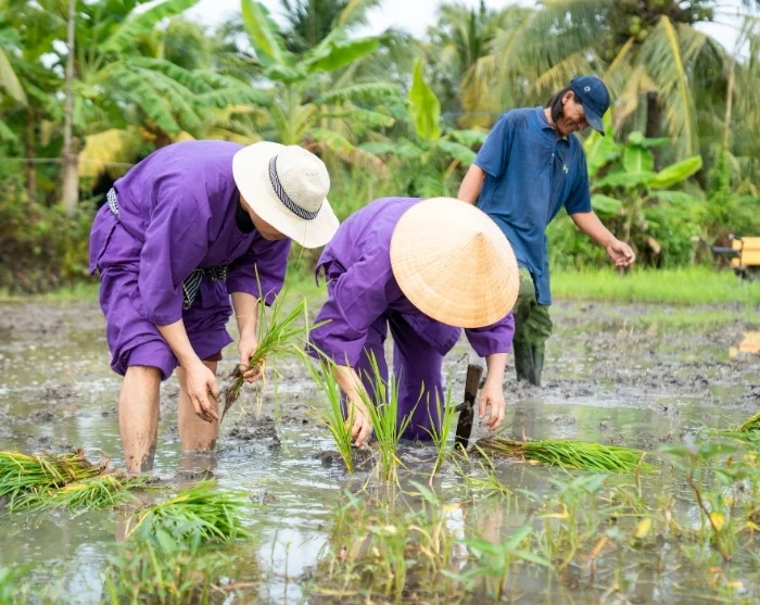Du reser vidare till vårt hållbarhetsprojekt i Vinh Long, som har startats av vår lokala samarbetspartner. En stillsam promenad genom byn väntar, där din guide under tiden ger dig inblick i projektets syfte. Du får också möjlighet att själv ta del av det traditionella lantbrukslivet. Tillsammans med lokala bönder kan du prova på risodling – antingen genom att plantera späda risplantor eller genom att hjälpa till vid skörden, beroende på säsong. Det är en lärorik och jordnära upplevelse som ger dig en unik inblick i vardagen på Vietnams landsbygd och i arbetet bakom ett hållbart jordbruk. När du deltar i utflykten bidrar du samtidigt till familjerna i Vinh Long, eftersom en del av resans pris går direkt till projektet, som du kan läsa mer om här.