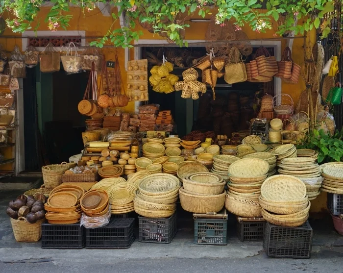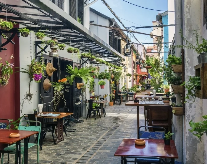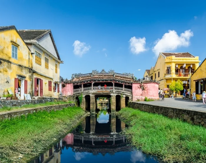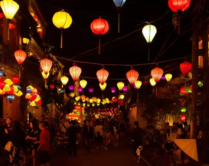 Bortom floden breder sig en labyrint av små, stämningsfulla gränder. Här möts du av en färgsprakande blandning av japanska trähus, kinesiska samlingslokaler, franska kolonialbyggnader och de karaktäristiska handelsbodarna. Färgglada lyktor hänger som girlander över gatorna och skapar en alldeles speciell atmosfär, särskilt när mörkret faller på kvällen. Butiker, gatukök, caféer och små restauranger ligger tätt och bjuder in till avkopplande stunder och nyfikna upptäcktsfärder.