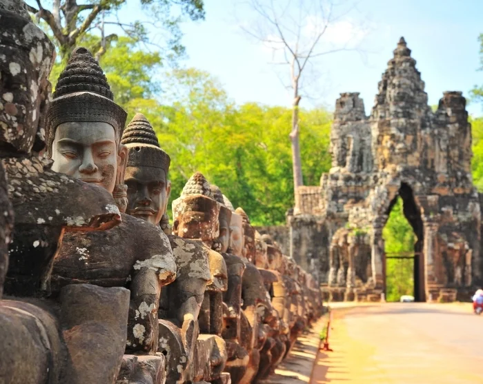 Dagen börjar vid Sydporten till Angkor Thom, där statyer av goda och onda gudar vakar över ingången. Härifrån fortsätter du till det ikoniska Bayon-templet, känt för de hundratals leende ansikten som pryder de höga tornen. De detaljerade basrelieferna är särskilt imponerande och skildrar både vardagslivet och de stora slagen mellan khmerfolket och de gamla thailändarna.