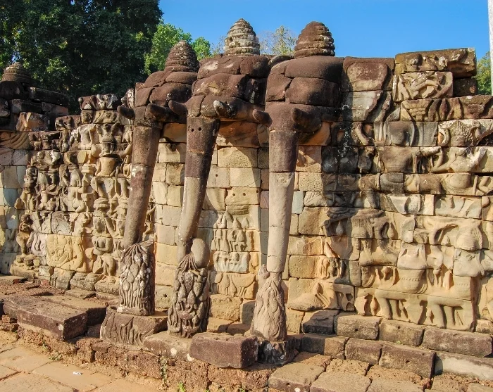 Missa inte heller Elefantterrassen där en lång rad utskurna elefanthuvuden bildar en mur. Härifrån kunde kung Jayavarman en gång i tiden överblicka sin armé. Strax intill ligger Terrassen för de Spetälska Kungarna med en staty av Yama, dödsgud i hinduistisk mytologi.