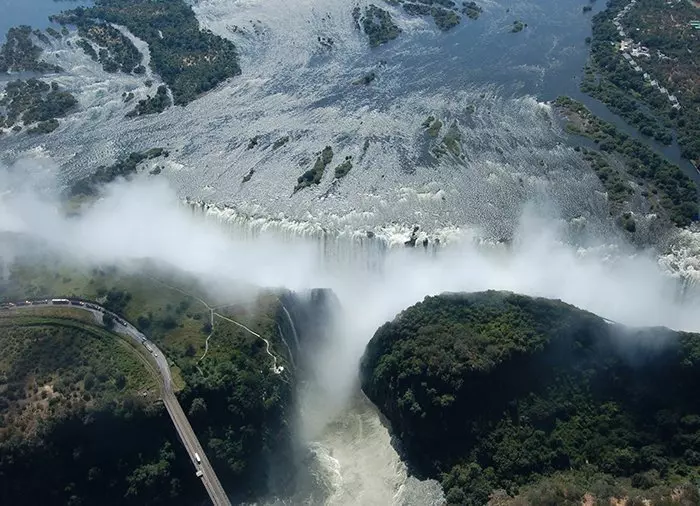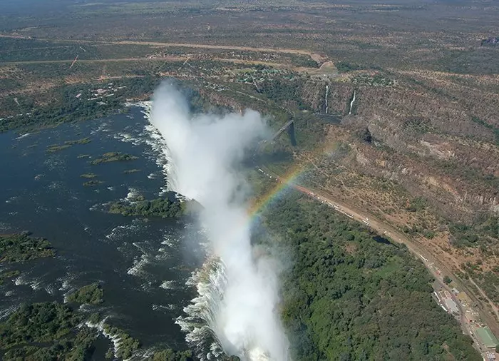 Det kan man däremot göra ovanifrån! Ovanifrån får du en spektakulär utsikt över de många ravinerna, som de enorma mängderna vatten har skapat genom tiderna. En lång helikoptertur ger naturligtvis flera möjligheter till riktigt bra bilder, och en kortare tur på 10 minuter bjuder på en fantastisk utsikt och goda möjligheter att få bra bilder med dig hem på vattenfallet i hela dess längd, inklusive regnbågarna, som nästan alltid bildas i vattendropparna från de rasande vattenmängderna. Det är inte utan anledning som Victoriafallen på det lokala språket heter Mosi-oa-Tunya, vilket betyder ”den dundrande röken” (”Smoke that thunders”).