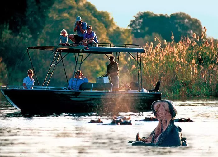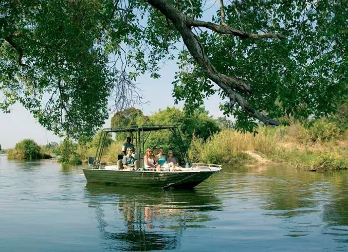 Vår samarbetspartner i Zambia är ett bland de få företagen som har tillåtelse att åka på den delen av Zambezifloden som kallas ”Lower Zambezi” – dvs. den delen av floden, som ligger närmast Victoriafallen. Med specialutformade båtar är det möjligt att åka till de små öarna, som ligger ovanför vattenfallet, för att få en vacker utsikt över ”den dundrande röken” och de många regnbågarna, som vattendropparna bildar på himlen.