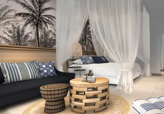 Här finns endast 40 rum som alla är inredda med konst på väggarna, färgrika kuddar och lampskärmar som skapar en trivsam kontrast till rummens kokosträmöbler. Varje rum har sin egen särprägel, men alla är utrustade med aircondition, platt-tv, minibar, värdeskåp och wifi. Alla rum har även egen balkong med trädgårdsmöbler.