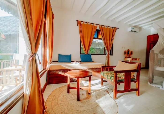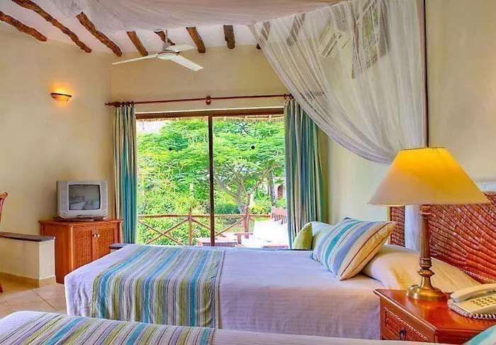 Här finns 96 rum som alla har myggnät, aircondition, värdeskåp, terrass och gratis wifi. Rummen är inredda i traditionell Zanzibar-stil med färgglada kuddar och lokal konst på väggarna.