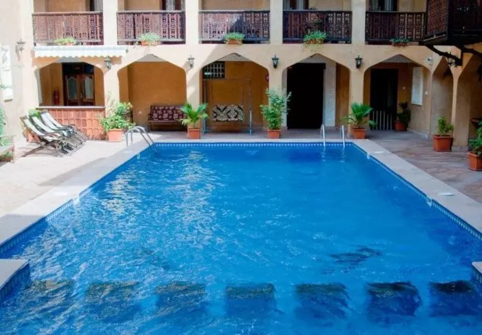 Hotellet är en gammal majestätisk byggnad inredd i arabisk stil och har i allt 29 rum. De flesta av rummen har balkong med utsikt över stranden eller swimmingpoolen på gården. Alla rummen har dusch, toalett, aircondition, kylskåp, telefon och satellit-/ kabel-TV. På hotellet finns det också swimmingpool, souvenirbutik, internet och tvättservice.