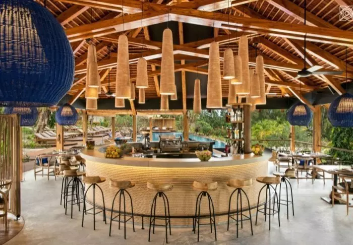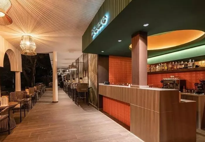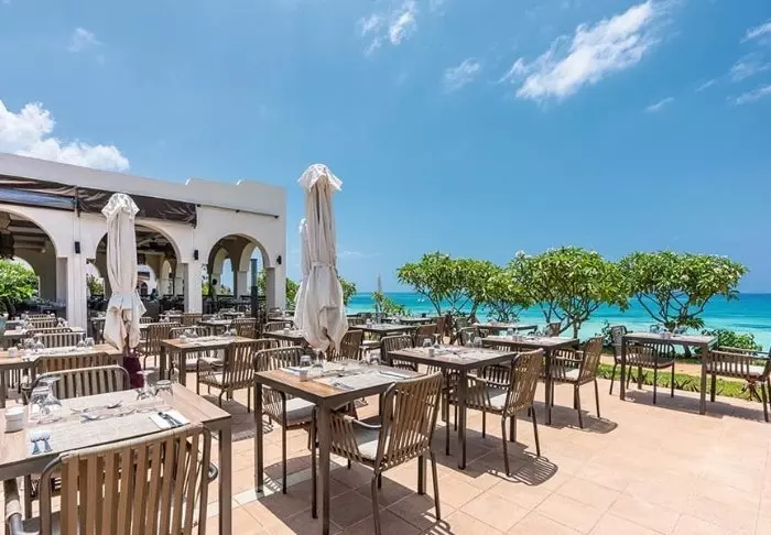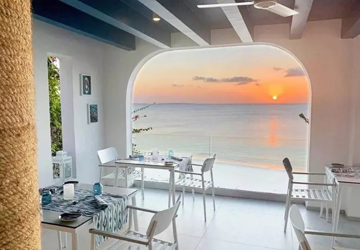 Restaurangen och loungeområdet är inredda med mjuka soffor och fåtöljer och bjuder på en vacker utsikt över stranden och havet.