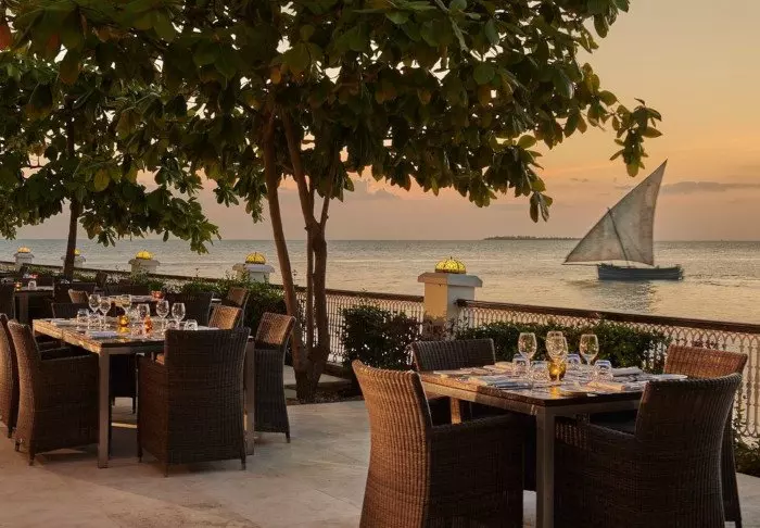 Den fina Mizingani Seafront Hotel ligger precis mellan Stone Towns stadskärna och den vackra stranden full med lokala fiskebåtar, vilket ger hotellet en vacker utsikt över den livliga hamnmiljön och Indiska oceanen. Det centrala läget gör hotellet till en perfekt utgångspunkt för att utforska stadens historiska sevärdheter och fina marknader.