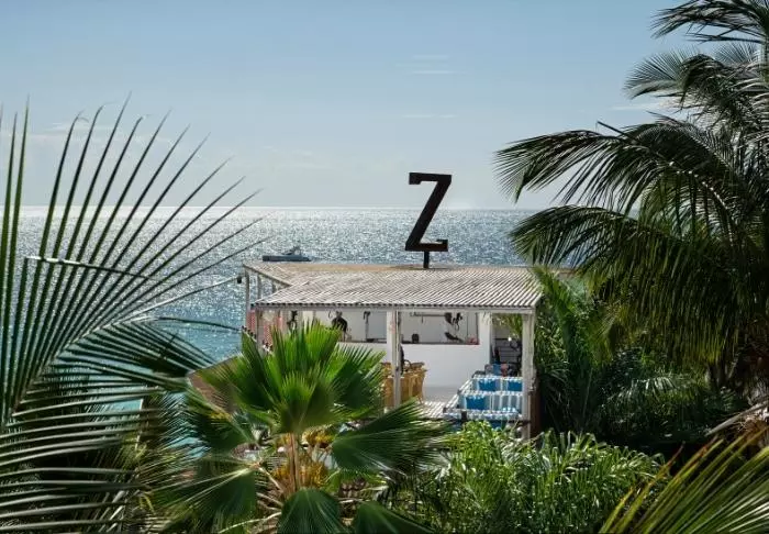 Från poolen har du utsikt till stranden, varifrån en pir går långt ut i vattnet. Halvvägs ute finns en bar och fortsätter du längre ut kommer du till en plattform med solstolar. Från plattformen går en trappa ner i vattnet så att du kan ta dig en simtur även när vattnet står lågt.