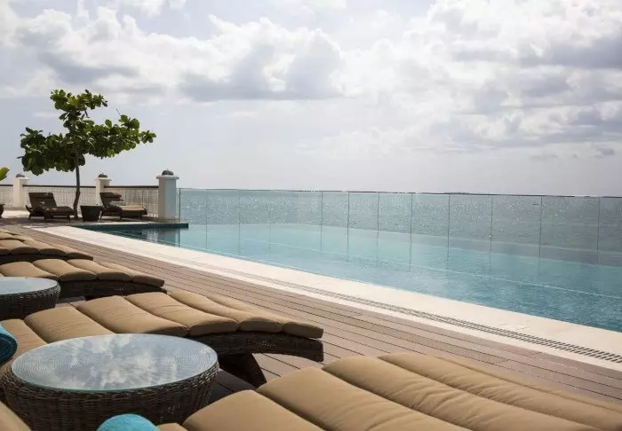 Oändlighetspoolen är enorm och har ”glasvägg” ut mot havet. Den 150 meter långa piren lockar med cocktails och öns bästa solnedgång efter en dag med tennis, spabesök, kajak, solbad, volleyboll, tupplurar i skuggan, ”korallrevspromenad”, rikligt med strutglassar vid poolen – och kanske ett besök vid den lokala delfinkolonin.