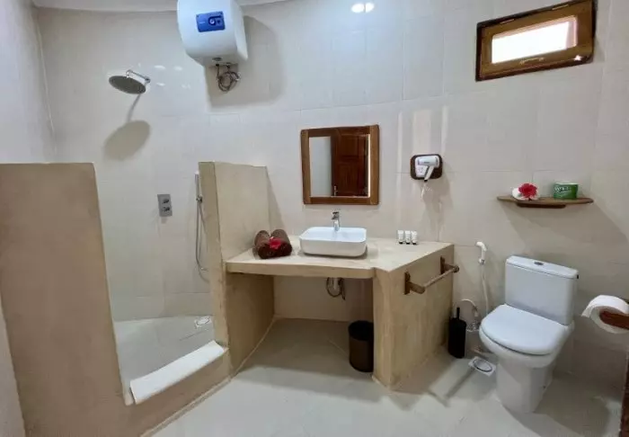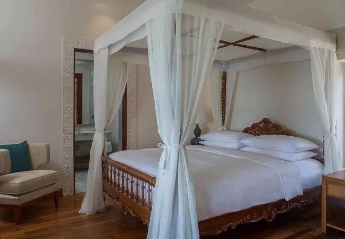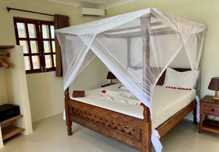 Och det handlar verkligen om villkor: här finns vardagsrum, sovrum, badrum och en stor terrass med egen pool. Villorna är inredda i en smakfull kombination av dämpade färger och mörka mahognymöbler i klassisk Zanzibar-stil. Med luftiga och stora utrymmen omkring dig känner du hur hela din kropp slappnar av så fort du kliver in i villan. Här finns allt du behöver: tv, aircondition, wifi, värdeskåp, utom- och inomhusdusch, badkar, te- och kaffefaciliteter osv. När du öppnar dörrarna till din privata terrass har du både solstolar och egen pool. Utanför dörren väntar ett par cyklar om du får lust att ge dig ut på upptäcktsfärd i närområdet.