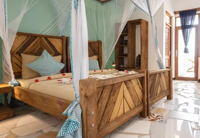 Här finns 96 rum som alla har myggnät, aircondition, värdeskåp, terrass och gratis wifi. Rummen är inredda i traditionell Zanzibar-stil med färgglada kuddar och lokal konst på väggarna.